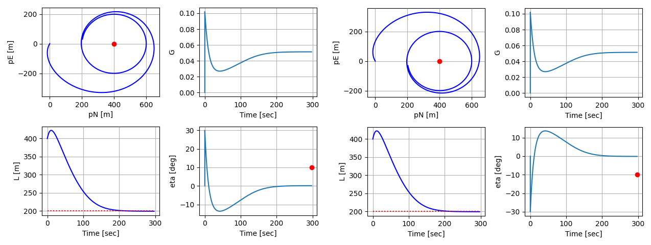 출발 속도 방향을 조절하여 좌선회와 우선회 조건으로 유도 법칙을 구현해보았다. 1사분면에 시간에 따른 가속도, 2사분면에 2차원 경로와 선회 중심을, 3사분면에 표적과의 거리를, 4사분면에 relative bearing angle을 표기하였다. 유도 법칙이 Lyapunov 안정도 조건을 만족하여 점근 안정성을 가지므로 시간에 따른 표적과의 거리가 선회 반경에 수렴하는 것을 볼 수 있다.