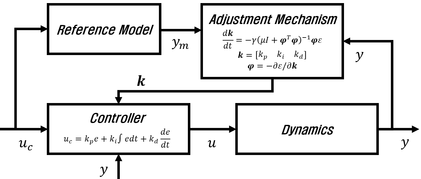 PID 제어기의 제어 이득을 적응 변수로 하는 MRAC의 구조를 살펴보면 다음과 같다.
