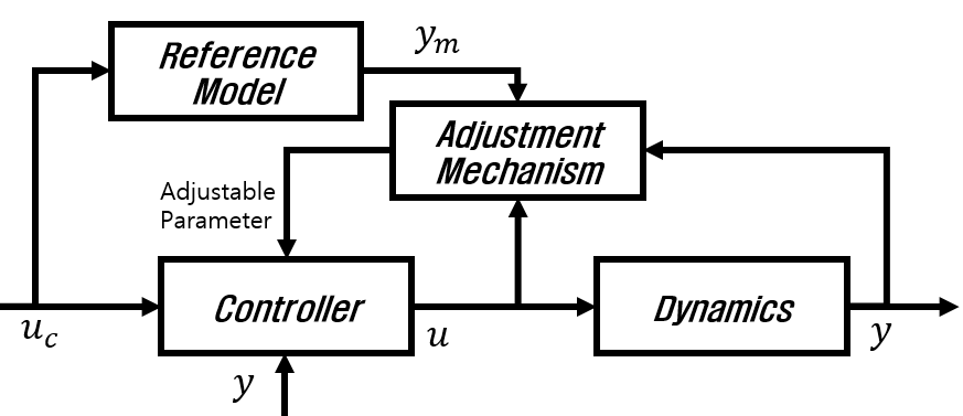 MRAC의 구조는 내부 루프로 기존의 피드백 루프, 외부 루프로 제어 변수 조정 루프로 구성된다.