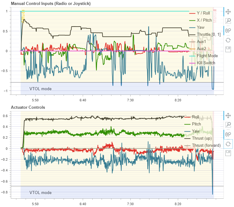전면 모터와 후면 모터의 추력 계수 CA_ROTOR_CT를 조정했음에도 불구하고 전체적으로 믹서에서 피치 키를 일정하게 치고 있다. 이는 후면 모터의 추력을 더 내게끔 명령하고 있어서 그런 것 같다.