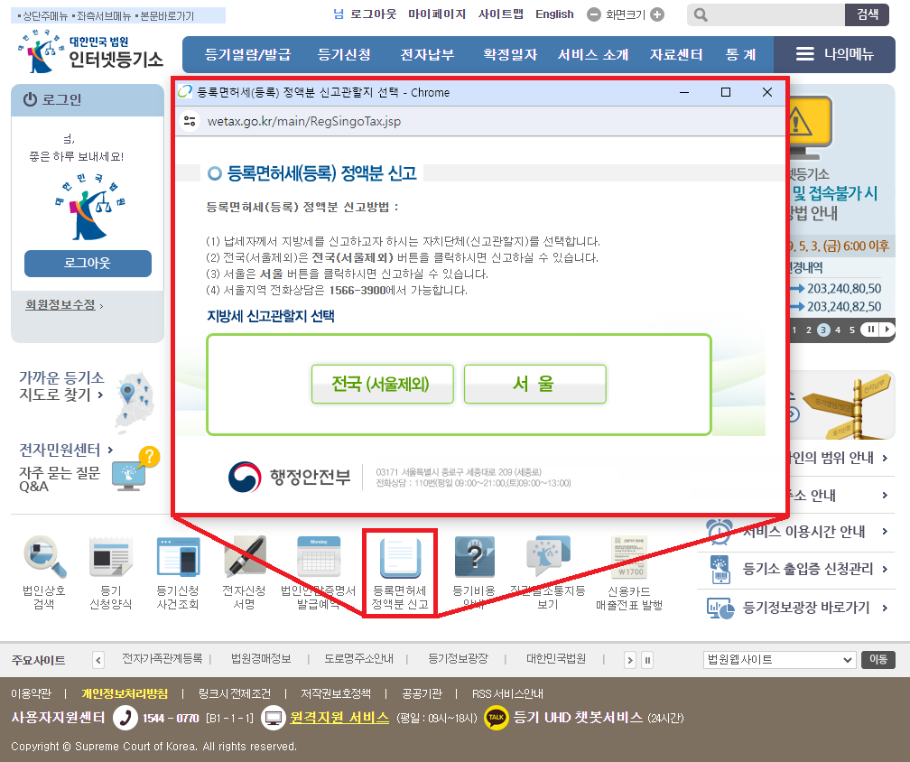 위택스와 인터넷등기소에서 둘 다 가능하다.