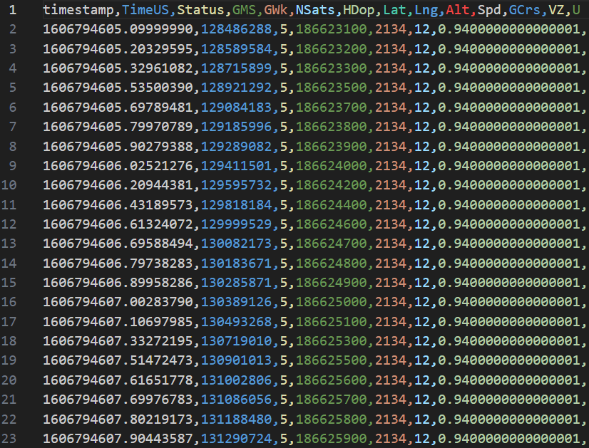 이를 통해서 *.bin, *.tlog 파일에서 csv 파일으로 다음과 같이 데이터를 추출할 수 있다.