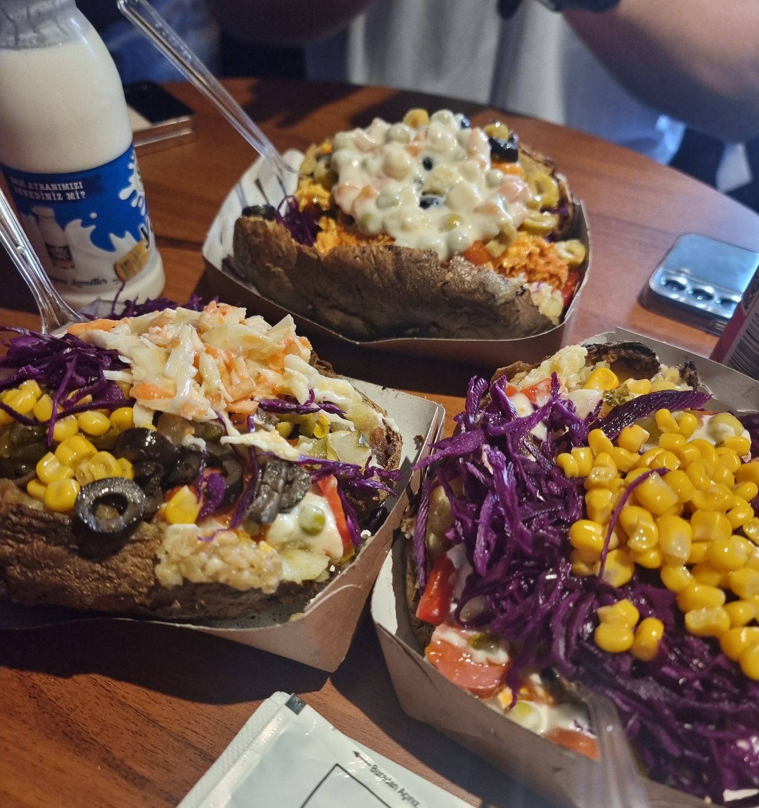 Kumpir 쿰피르 는 드럼통에 구운 감자를 반으로 갈라서 여러가지 토핑을 넣어서 먹는 음식이다.