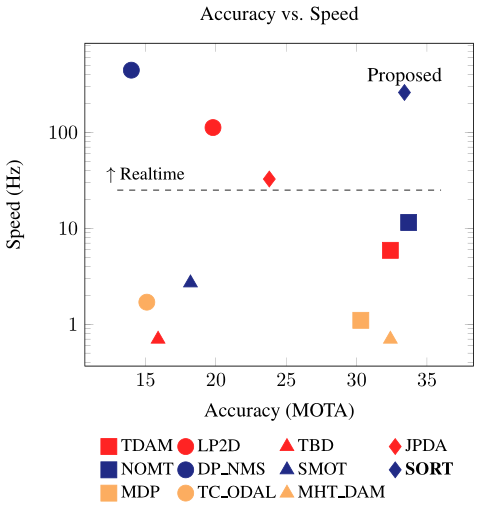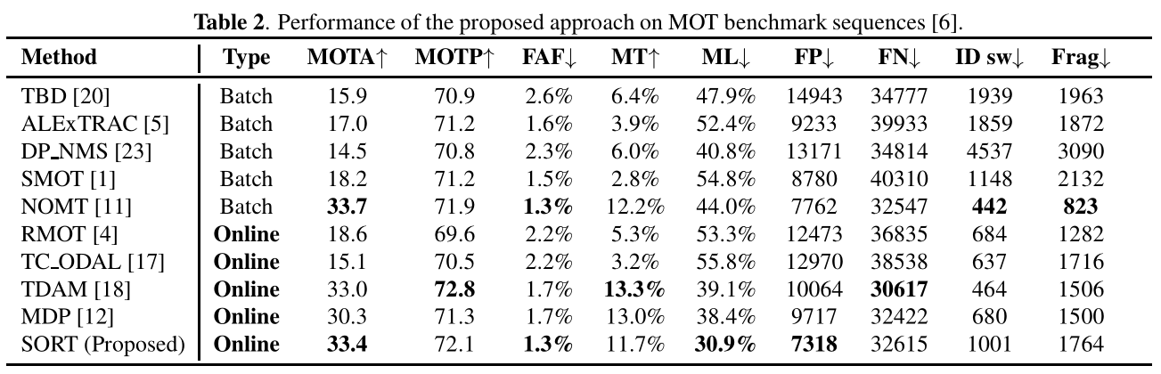 - SORT는 Online and Realtime으로 사용가능하며 논문에서 벤치마크 테스트로 제시한 성능은 260Hz으로 매우 빠르다.