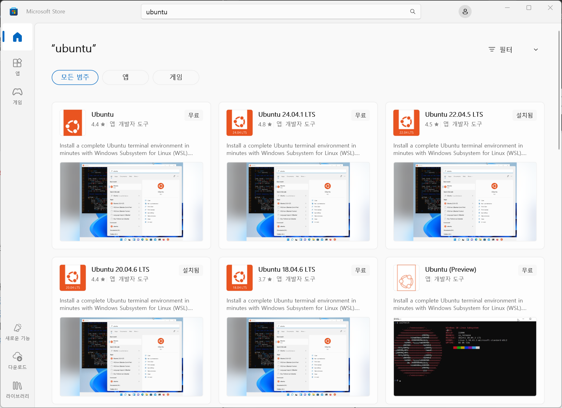 방법 1. Microsoft Store 에 가서 원하는 Ubuntu 버전을 설치한다.